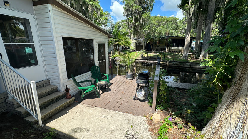 Tie up to this wonderful canal front home, that leads you to Big Lake Harris and the chain of lakes. This lovely home floor plan includes 2 bedrooms, 2 bathrooms and a den. Features include luxury vinyl planked flooring, primary with en-suite, dressing area and walk in closet, outside screened area for chilling and open deck area for grilling.