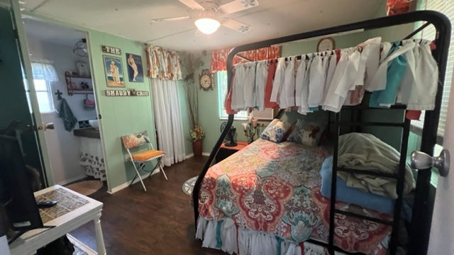 Painted a peaceful ocean color, it has gorgeous engineered wood flooring throughout, an electric fireplace and the common area is inclusive with the kitchen that has very nice wood cabinets and a unique island that is moveable and folds out for a snack area. One bedroom features an eclectic array and has an updated powder room. The secondary bedroom hosts a queen size bed. The main bath is large and features a walk-in shower. This home is on septic tank and spring well water. Call today to make it yours.
