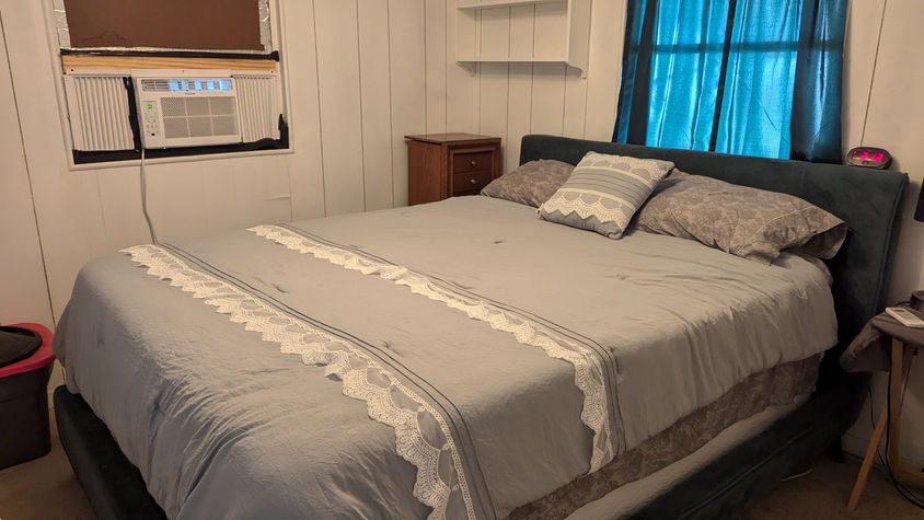 The second bedroom includes a spacious closet and a convenient half bathroom with a toilet and sink. A hall closet provides additional storage. The sizable master bedroom features a large closet and a brand-new window air conditioner installed just three weeks ago. For accessibility, there is a handicap ramp at the back door.