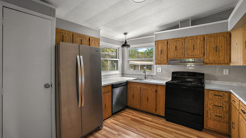 New roof, new vinyl siding, new vinyl windows, newer HVAC and freshly updated 2 bedroom 2 bath and over 1,300 sq ft home is ready for carefree living. Large primary bedroom with generous walk-in closet. Enjoy relaxing in your Florida room with a cup of coffee in the mornings. All appliances are included. The vaulted ceilings add to the spacious feeling. Rolling Greens voted number 1 resort style home in Florida. Water, sewer, lawn, curbside trash pickup twice a week and access to all the amenities are included in the monthly lot lease. Unlimited golf membership for only $500.