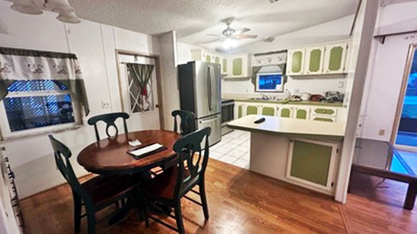 This home is across from the gazebo and a view of the lake. 2 Bedroom 2 bath home with open concept living, dining and kitchen. Front screen porch, New double pane windows throughout the home, New refrigerator, stove and light/fan fixtures. Comes with 2 sheds and utilities shed for the washer and dryer. Enclosed carport with just 6 inch step into the home. Beautiful landscaping and extra parking for your golf cart. Call today and turn this house into your home. Showing available 7 days a week!